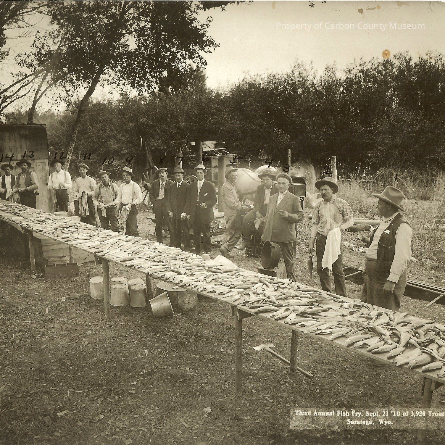 6/2010 Mystery Photo information: The photograph was of the "Third Annual Fish Fry, Sept. 21, '10, of 3,920 Trout Saratoga, Wyo." as written on the front of the photo from the negative process. A handwritten note on the back of Dick Peru's (Saratoga) copy identified the men from left to right: Gene Freeming, Bert Reynolds, John "Whitey" Miller, Ear Jugg, (?) Peckham, Sam Moore, Ed Haggarty, Duke Hanley, Clyde Lashbrook, Platt Hinman, Wilbur Hugus, Frank Gramer, Dave Wilcox, and Charles Taylor. According to Mr. Perue the fish fry was a promotion given by Saratoga and Encampment Railroad to celebrate Railroad Days and promote the railroad and the Saratoga/Encampment Valley. Haggarty started the copper boom in Grand Encampment mining district; Wilcox ran the livery stable, Taylor was the town marshal, Hugus was one of the town founders, postmaster and builder of what is now Shively Hardware; and Moore was associated with Sisson (Wolf) Hotel.
