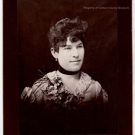 Update - 2009: Three original black & white studio portraits. Each attached to dark matboard. Image is young woman with dark hair in an updo. she has light colored eyes, & is wearing a black ribbon choker around her neck. Her V shaped neck edge of dress top has a fancy lacy collar with an ornate floral corsage on her side right neck & bodice edge. A clear drop earring hangs from her right ear lobe.
