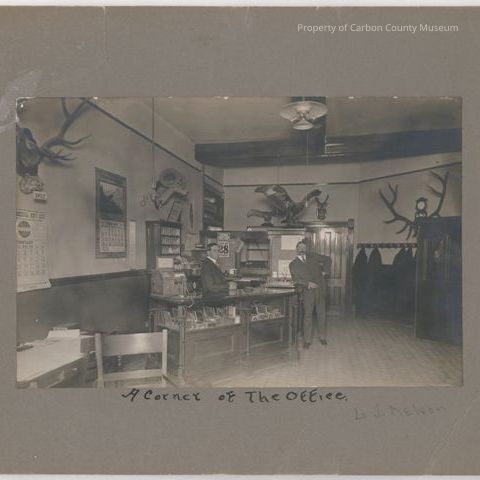 Update - 2009: Black & white print on grey mat. Image of room interior & two men standing near a glass & wood counter. On the walls are two sets of elk horns, a big horn sheep head, an antelope head, two eagles & calendars. The calendars are in February of 1910. A daily calendar shows: "February 28 Monday". There is a large wood door on back wall & coat hooks on wall to photo right. A sign on top case reads: "Free cigars" There is a wood case on wall with dividers & a couple of papers inserted in bottom row. The two men are wearing dark three piece suits, man on right has a mustache. Two lights hang from a tall ceiling. 400 block of Buffalo Street.