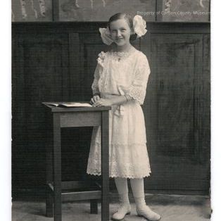 Update March 2011: Black & white studio portrait of a girl standing beside a tall, square, wood table. A booklet is laying open on the table. The girl's dress is white, 3/4 sleeve length, no collar with lace eyelet trim at neck, bodice, sleeves & both skirt layers. She wears a necklace with a cross pendant & a bracelet on her left arm. She has large bows on either side of her pinned up hair, white socks & button ups shoes. Her hands are on the table top.
