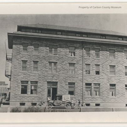 Update 2009: Black and white print. Image of a multi-story stone building with a vintage automobile parked in front . Sign above door on building, "The Virginian." Sign on car; "Tonight Big Dance". People and bicyclist around car. Building in background has sign: "W. F. Shields General Merchandise".