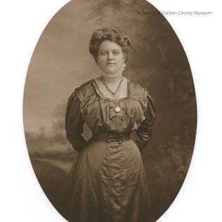 Oval photo of woman in dark dress.