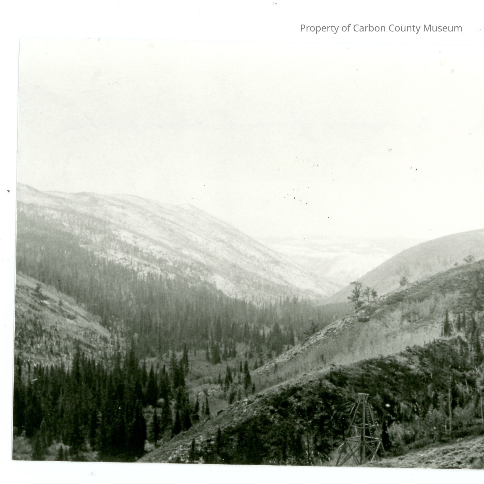 Update - 2009: Black & white print of a mountainous treed vale with other mountains in the far distance. A rocky area with sparse vegetation is in foreground. Two wooden high tripod like structures with ladders on their backside are spaced at intervals down the side of the hill in the foreground. (We know this to be part of the aerial tramway from the Ferris Haggarty Mine).