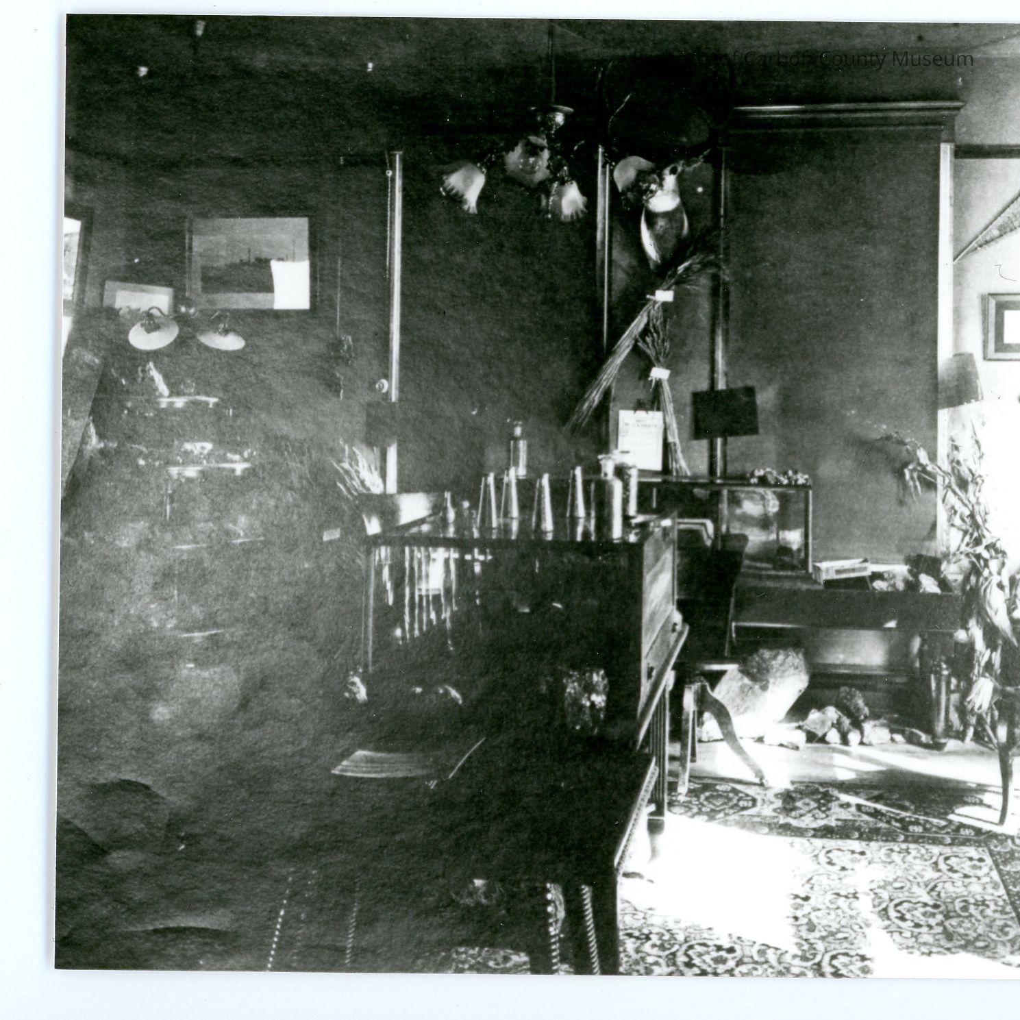 Update - 2009: Black & white print showing the interior of a room which there are two large corner four shelf wooden display stands on which many large, medium and small size rock chunks are placed. One stand is placed at corner left & the other at corner right. Rock chunks of all sizes are on the floor in background & on a small table above them. There is a large dark table with elevated drawer section fixture at room center. A few rock samples are on the table surface. At top level of elevated section are seen multiple bottles of various types & sizes. The walls have photographs hung at various locations. There are ornate hanging light fixtures at three areas. Top right corner has a pair of snow shoes hung on wall. There are several wooden chairs of different types placed to face room center. The floor carpet is an ornate paisley type design. side left of print is extremely dark & side right is extremely light at top. A large mounted elk head hangs at back wall. Light from window creates a pattern on the floor.