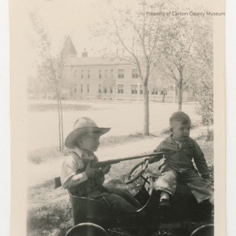 Update - 2009: Black & white print. Snapshot. Image of two young boys playing in a toy car on a grassy lawn. Sidewalk, small trees, street & large building in background. One boy is sitting the driver's seat holding a toy rifle; he is wearing a cowboy hat, light shirt & dark overalls. Second, younger boy is seated on the hood of the car & is holding onto the steering wheel with his right hand; he is dressed in a jumpsuit.