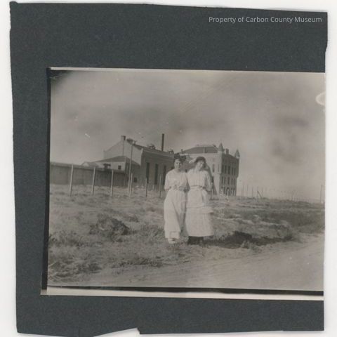 Update - 2009: Black & white print. Snapshot. Mounted on black paper. Back of paper contains 2 more partial images - cut from an album. Image of two women standing on the side of a dirt road with fence & large multi story building in background. Women are wearing long white dresses; the woman at left has large dark bow on top of her head; woman at right has dark hat with what appears to be a large white bow at back.