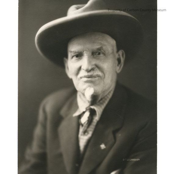 Update 2009: Black and white photo of an elderly gentleman wearing medium sized western hat. He has mustache and goatee. He has a suit jacket and tie. Shirt is pin striped.