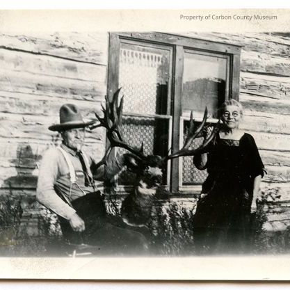 Update 2009: Black and white photo of a man and woman on either side of a deer? head. Man is sitting down with deer head propped on his left knee. He is holding the deer by the base of the antlers. The lady is standing on the right of the deer head holding onto the antler by an upper point. They are standing in front of a log building.