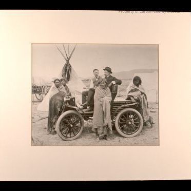 Update - 2009: Image of two men in a vintage automobile and four Indians wrapped in blankets. Tipi, tent and wagon in background. Indians have gathered around automobile and individual at right is leaning on the back of the automobile. Back end of a dog can be seen at his feet. Man in drivers seat is dressed in full suit, hat and gloves. Second man is in shirt sleeves, vest, dark pants, polka-dot tie and cap.
