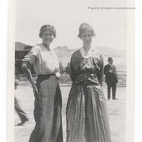 Update 2009: Black and white print of two ladies. Lady on left is smiling. She has her right hand on her right hip and is wearing a long dark skirt with light colored blouse. Lady on right has on a dark colored dress with large stripped tie at waist and pleated skirt, light colored blouse shows at neck. There is another smaller circumference skirt under pleated one continuing to her feet . A well dressed man is in background to left.