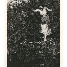 Update 1/2008: Black and white print. Snapshot. Image of a young woman in a tree .She is wearing a casual light colored dress, white stockings and white shoes. She appears to have a canvas bag(?) tied around her waist.