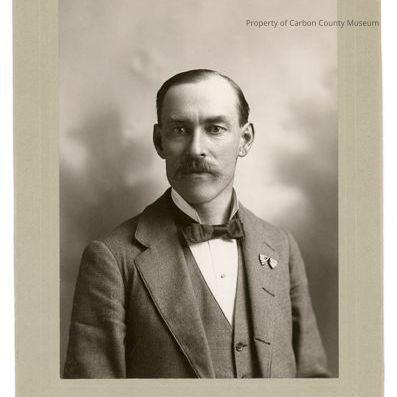 Update 1/2008: Black and white print. Studio portrait. Mounted on green matboard. head and shoulders portrait of a man in a medium-colored suit with vest, white shirt with stand-up starched collar and dark bow tie. American flag(?) bow shaped pin in his left lapel. He has a mustache and short receding hair. Painted backdrop behind. Engraved in lower mat margin: "J.E. Stimson" "Cheyenne, Wyo".