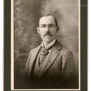 Update 1/2008: Sepia print. Studio portrait. Mounted on dark green matboard. Head and shoulders portrait of a man dressed in a medium colored suit with vest, white shirt with standup starched collar, and cravat with jeweled fly pin. He is wearing glasses and has a mustache.