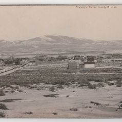 Update - January 2010: Black & white print attached to a grey matboard which has been almost complete cut off. Image shows an early day town in the distance with various buildings & a primary dirt road on side left. A church? with steeple is seen at side right. A slight mountain range is seen in distant horizon with some snow. Arid land & vegetation in foreground. Ground appears to be snow covered.