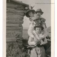 Update 2008: Black and white print, 2 3/8 x 3 3/8 of four women standing in a vertical row with each ones arms clasped around the woman in front of them on shoulders or upper body . Woman i front is wearing light medium color pants with white long sleeve shirt with ruffled collar and cuffs, dark sash? at waist and wearing dark hat over short hair. Woman behind her has medium colored straw hat with wide ribbon around crown, has white blouse with darker vest over it. Third woman has medium color short brown hat with short hair and medium colored jacket. Woman at top is slanted to photo left and wearing a wide brimmed hat. Unable to see her clothing as she is covered by the other women's bodies. A rustic log cabin is to their right with weeds at the base of building.