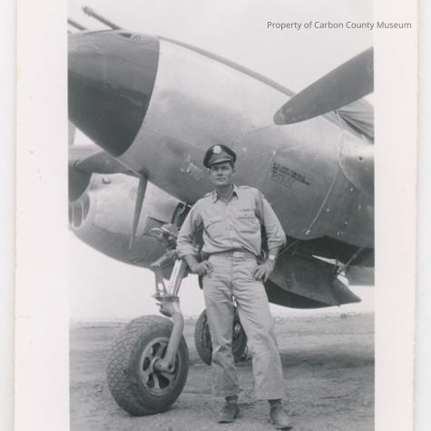 Update 1/2008: Black and white print. Snapshot. Image of a man in military uniform posed in front of twin engine U.S. Army Air Force plane parked on a dirt field.