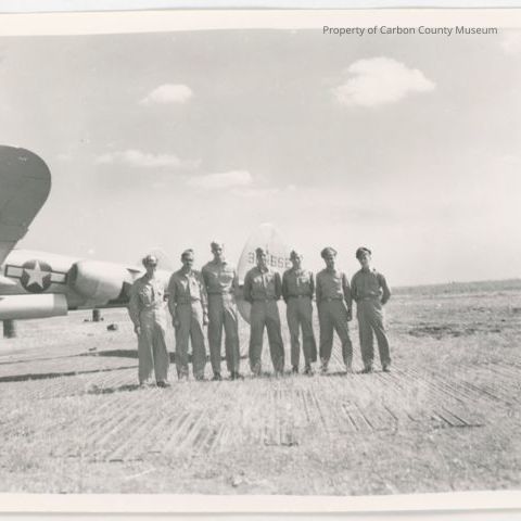 Snapshot of 7 Air Force men standing by an airplane, Sept., 1944. 305th. Col. Nelson, C.O.; Col Morgan; Maj. Isaacson; Lt. Rosier; Lt. Shaw; Capt. Andersen and me.
