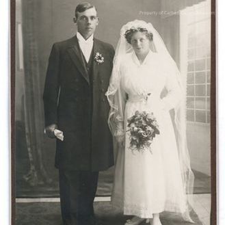 Update March 2011: Black & white studio portrait on a dark brown mat. Image of a man & woman standing, possibly a wedding photo. The man is wearing a dark, three piece suit , the jacket is long, a white shirt & tie. He has a white object in his right hand (possibly gloves), which is down at his side. The woman is wearing a white dress that has long sleeves, has a fabric belt with a flower pinned in the center, ruffles of lace at the hem line & on the cuffs of the sleeve. A veil is on her head & down over her shoulders & back continuing to the floor. She has a bouquet of flowers in her left hand & her right hand is at her side. Her socks & shoes are white, the shoes have a bow on the toe & a slight heel.