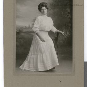 Update - March 2010: Black & white studio print on a grey mat of a woman sitting on the arm of a wood chair. She is wearing a white fancy dress. It has a high round collar, square neck with lace & ribbon inset across the front, belted waist, flowing skirt with vertical seams below the waist & more lace & ribbon inset. The bottom portion has three pleats above a wide hem. She has dark hair pulled high up on her head. The backdrop is a studio prop of a country side scene. Engraved in lower right corner of mat: "The Ferris Studio Rawlins Wyo."