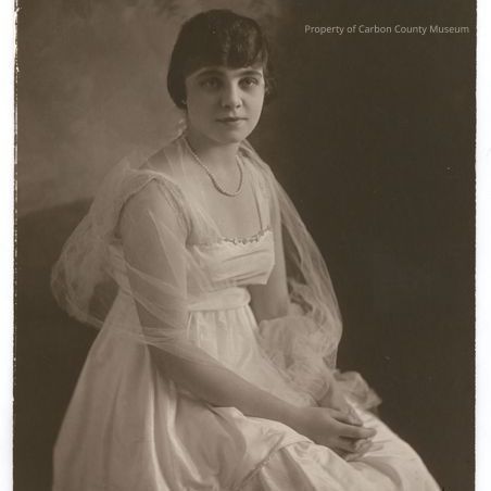 Update March 2011: Black & white studio portrait of a seated woman. She is wearing a white, silky fabric, layered skirt, & the dress top has thin straps, an embroidered row of flowers across a low neckline & her shoulders are covered with a netting fabric that continues around her arms. She wears a strand of pearls around her neck & her hands are together in her lap. Her hair is dark, short & curled across her forehead.