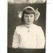 Update - 2009: A narrow continuous strip of three tiny square black & white prints vertically arranged. Top square is of two children seated together. An older girl with dark hair is wearing a white long sleeved blouse. She has an elaborate white head covering with bows on each side at ear level. The younger child with blonde hair & wearing a white dress? is leaning into the older girl.