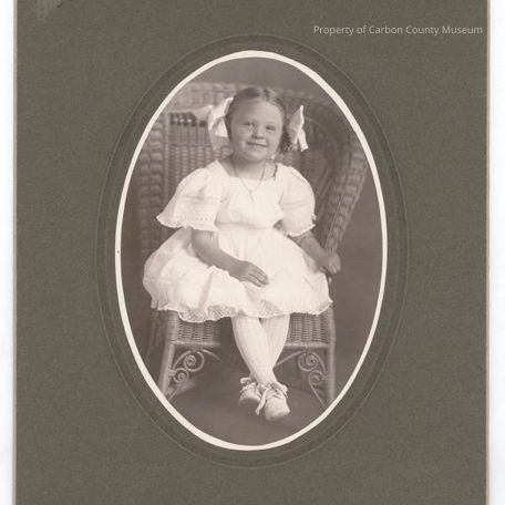 Update March 2011: Black & white studio portrait on a dark tan mat. Image of a young girl sitting in a wicker chair. She wears a white dress with a square neck line, short sleeves, lace & eyelet trim at sleeve ends & hem line. Her socks are white textured pattern & shoes are white, low lace up. She has her hair parted in the middle & a large white bow on a folded braid at her ears. The wicker chair is child size. The girl is smiling & her right hand is across her lap & her left hand is on the chair. Print is in an oval shape.