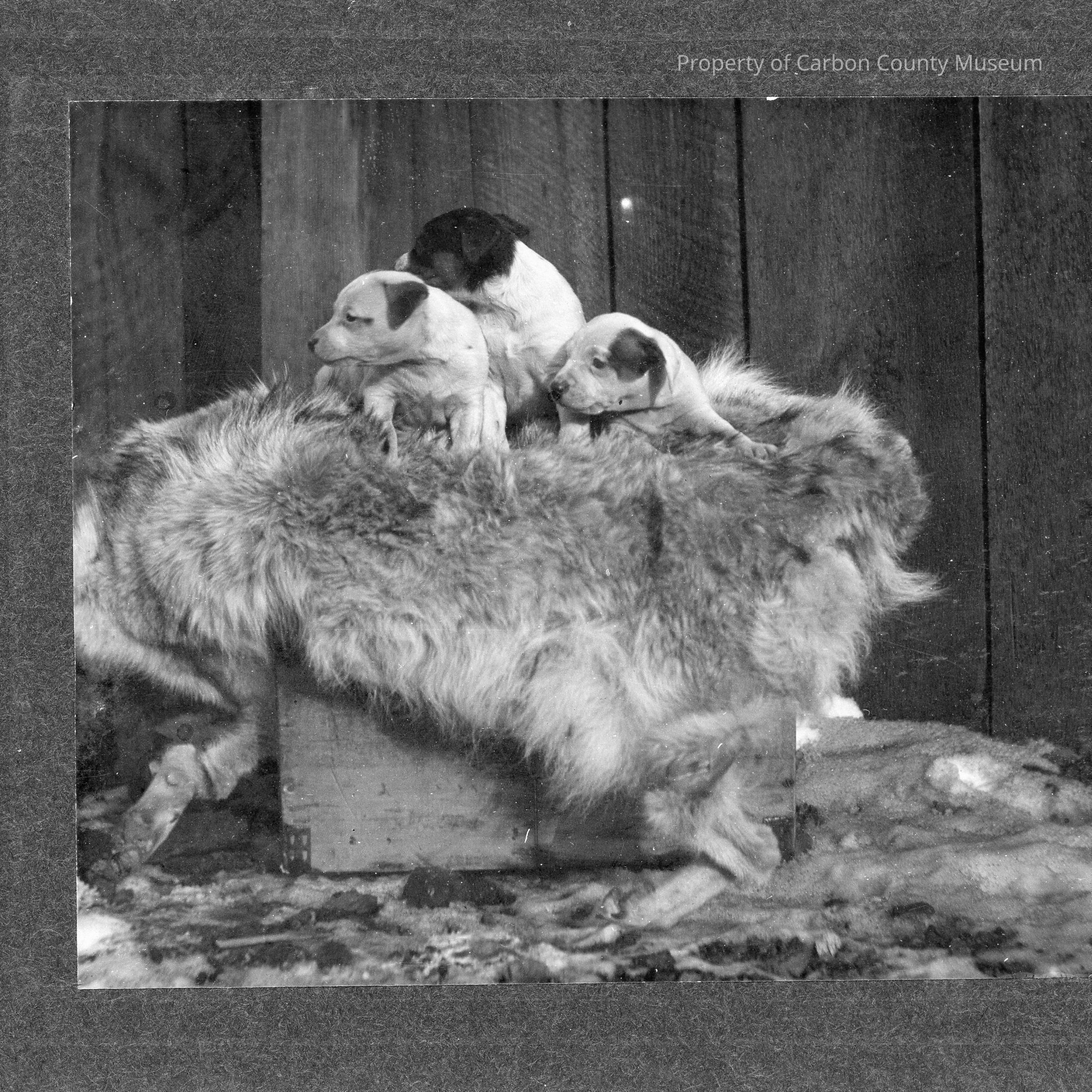 Update 1/2008: Black and white print. Photo of three puppies on an animal pelt. The pelt appears to be on a box which was set on a table or bed. The wall in the background is made of wood planks. All three puppies have dark ears.
