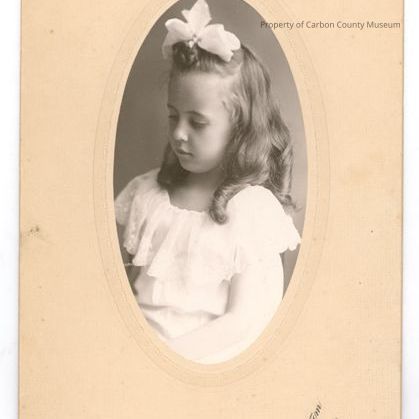 Update March 2011: Black & white studio portrait on a cream mat. An oval image of a young girl with dark hair in long ringlets & a bow tying up the top of her hair. Her dress is light colored with a round neck & large shawl collar of lace. She is looking down & toward photo left. A decorative border surrounds the image.