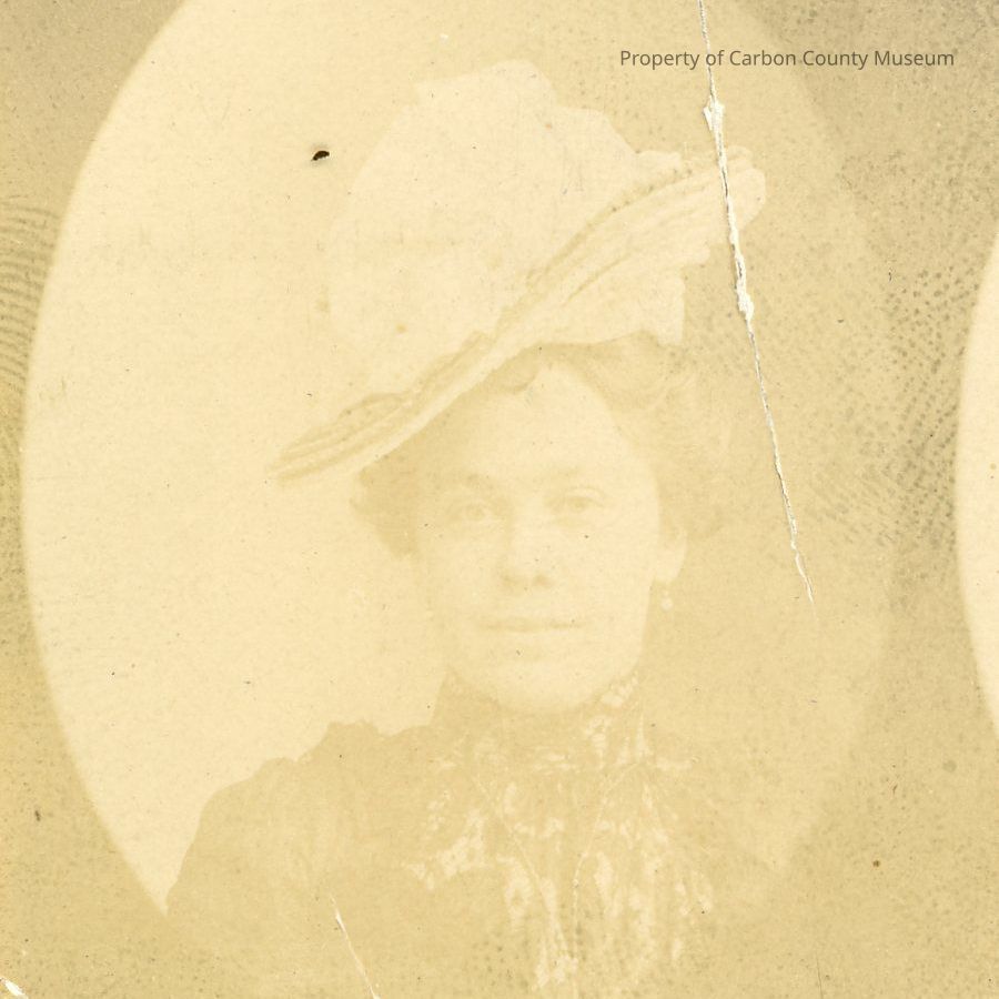 Update 1/2008: Black and white print. Photo of a lady in a hat which is tipped to the left side of her head. Lady has on a high collar, dark colored dress.