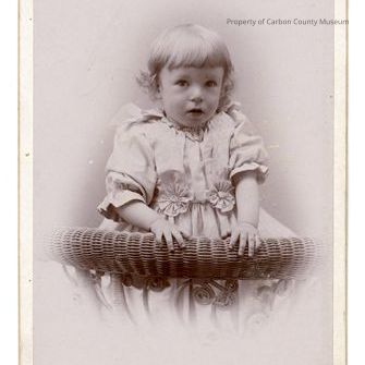 Update March 2011: Black & white studio portrait on a white mat. Image of a very young girl with light colored short hair curled on the ends & straight bangs. She wears a medium colored dress with bows at the shoulders & overlay straps continuing to the waist where fabric flowers are sewn. The sleeves come to her elbow & are puckered & then flare at the end. The girl is holding on to the back of the wicker studio prop.