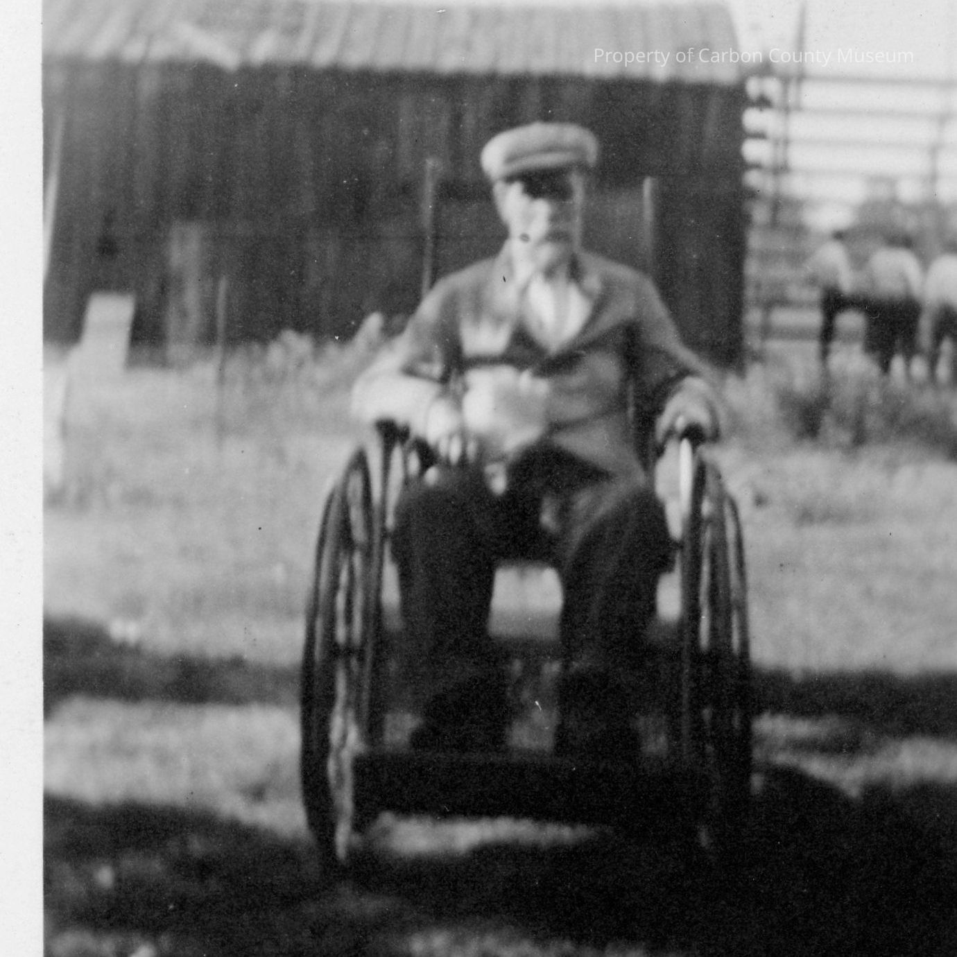 Update 1/2008: Black and white print. Photo of an elderly gentleman in a wheelchair. He has on a light jacket, dark pants, and cap. He has a beard and mustache. Photo was taken in a yard under the shade of a large tree. Shadows of the tree are seen on the ground. High fence? in background has several men standing in front of it. Fence? appears to be attached to a barn like building.