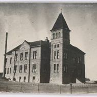Update 1/2010: Black and white print. Snapshot. Image of a multi-story stone building with a square tower to left of front entrance. Tall smoke stack at left corner, at back. Buildings in background. Raised foundation with full basement. Entrance on right side at top of stairway. Small bare trees in yard; wrought iron fence around property.