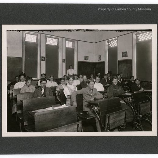 Update 2/2010: Black and white print on black mat of school classroom. There are 4 rows of wood desks with front of desk connected to fold up seat of desk in front. There are 23 students sitting at the desk with a female teacher standing behind the desks. there are large rectangular windows with shades pulled and smaller window above them that tilt open.