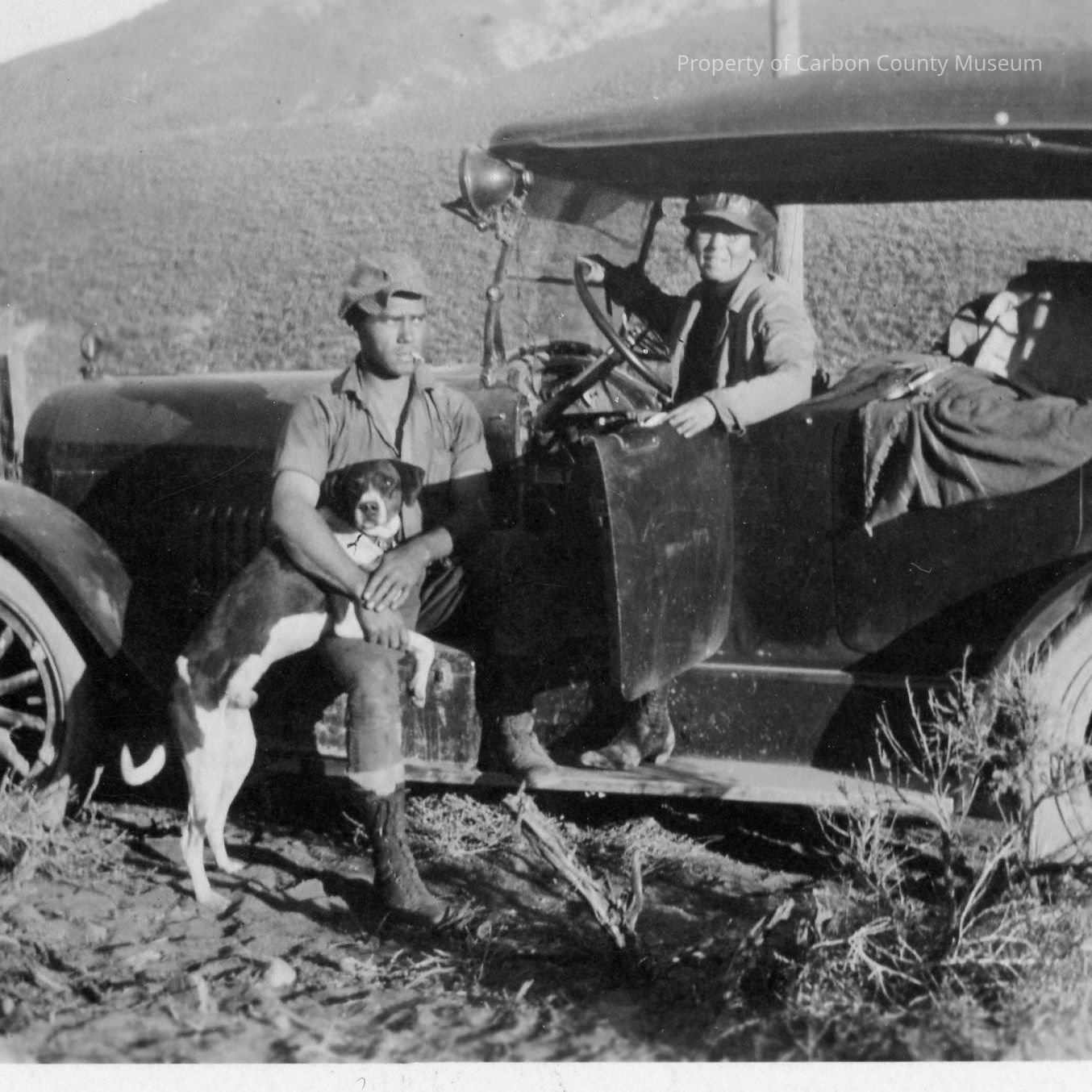 Update 1/2008: Black and white print. Photo of a two seater car parked in a field. Photo is showing a side view of the car. Behind the steering wheel is a man wearing a cap and a light jacket. He is looking toward the camera. The second man is sitting on a front fender box and has a dog standing on its hind legs with front paws on man's s right leg. A big hill is in the background. A utility pole can be seen on far side of car. A Banner on back of car reads "Rawlins".