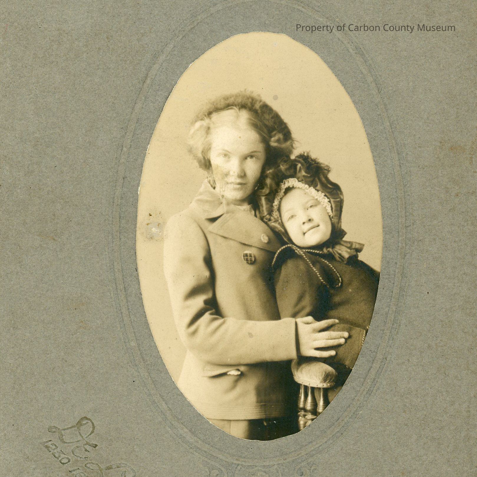 Update 1/2008: Sepia print. Photo of two young girls. The older girl is standing and has on a hand made cap sitting back on her head. She has on what appears to be a two piece suite. The youngest girl is leaning up against the younger girl. The youngest girl has on a bonnet and what appears to be a jacket. The younger girl must be standing on a box because the oldest girl's head is touching the top of the younger girl's head.