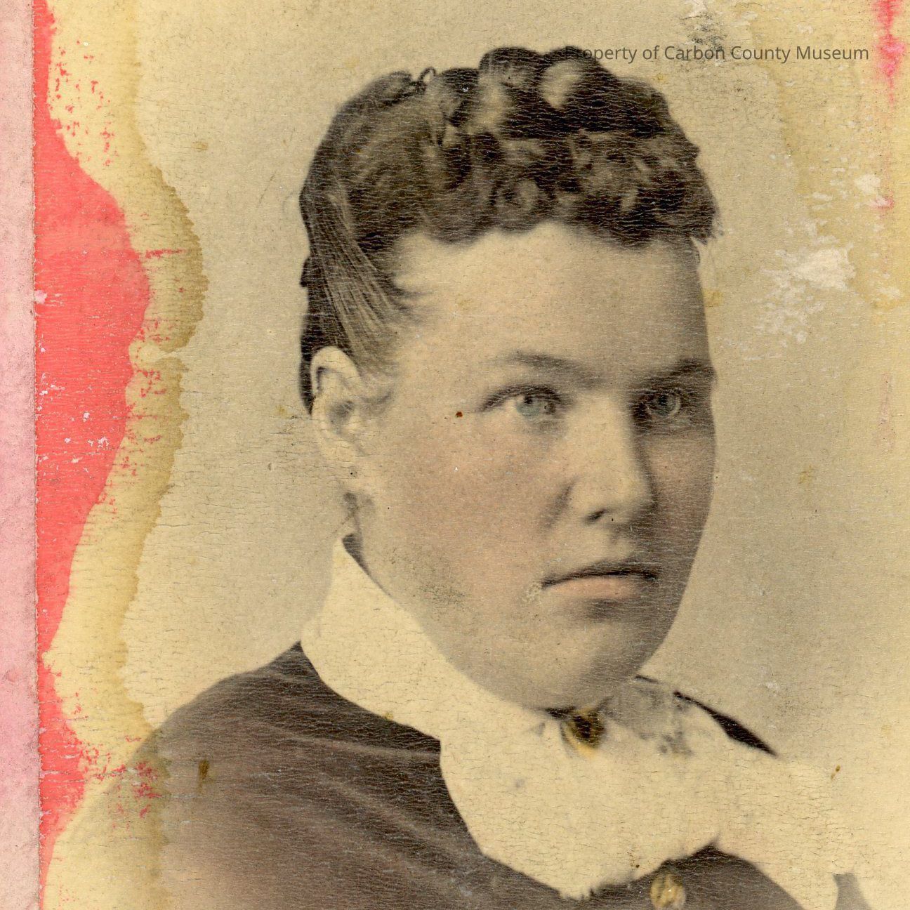 Update 1/2008: Hand tinted Carte-de-Visite. Print of a lady whose hair is tightly curled on the front of her head. The rest of the hair is pulled back in a short hair style. Her cheeks are painted a light pink and her eyes painted blue. She has on a dark dress that buttons up the front. He has a white high collar and big white bow at the collar line above the buttons.