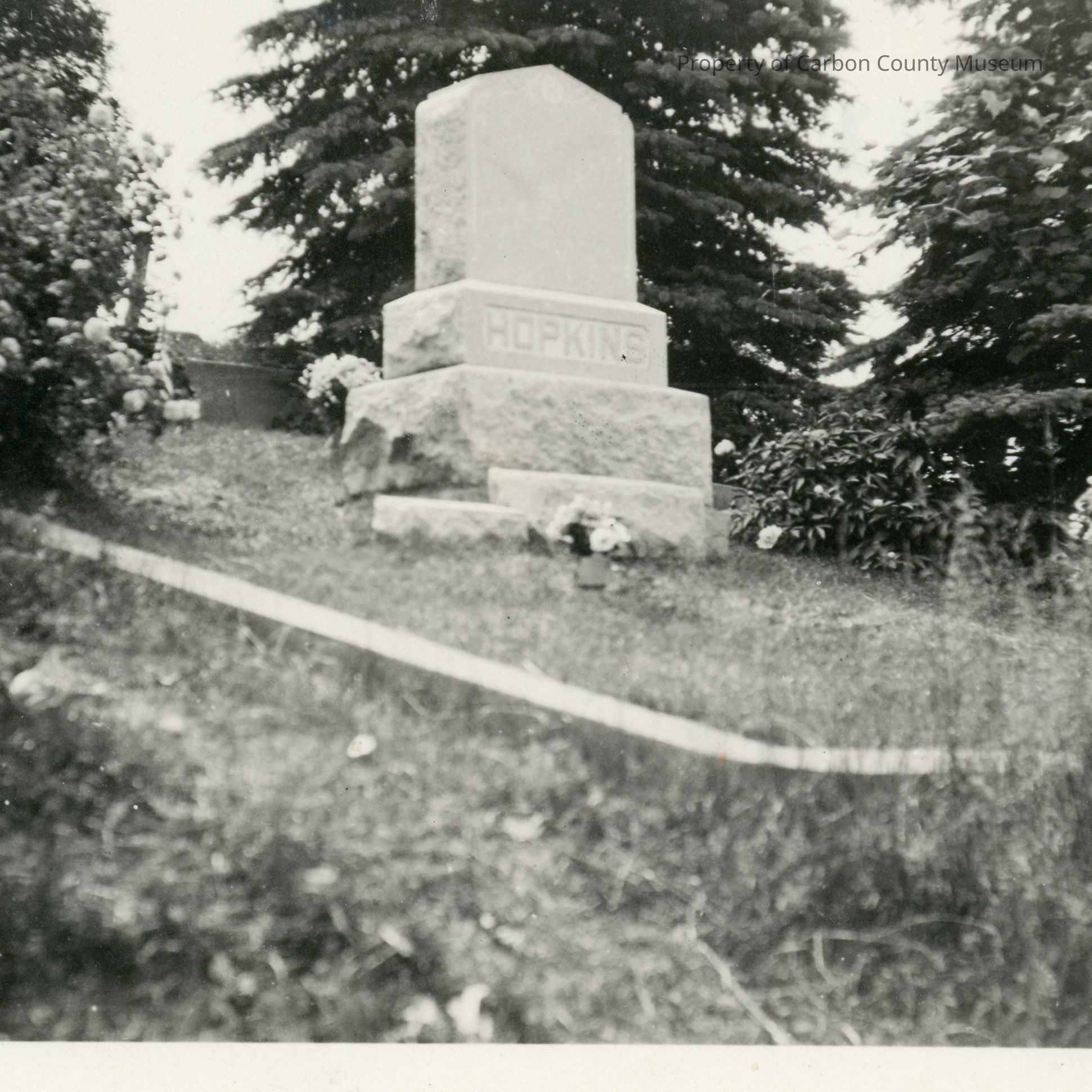 Update 1/2008: Black and white print. Photo of a cemetery. There is a small wall around a family plot. In the center of the plot is a large grave marker with "Hopkins" engraved on the second tier. The marker has a tall center stone sitting on three tiers. There are three big trees behind the plot. There are flower bushes in the plot. there is a man that appears to be tending a grave just left of the family plot.