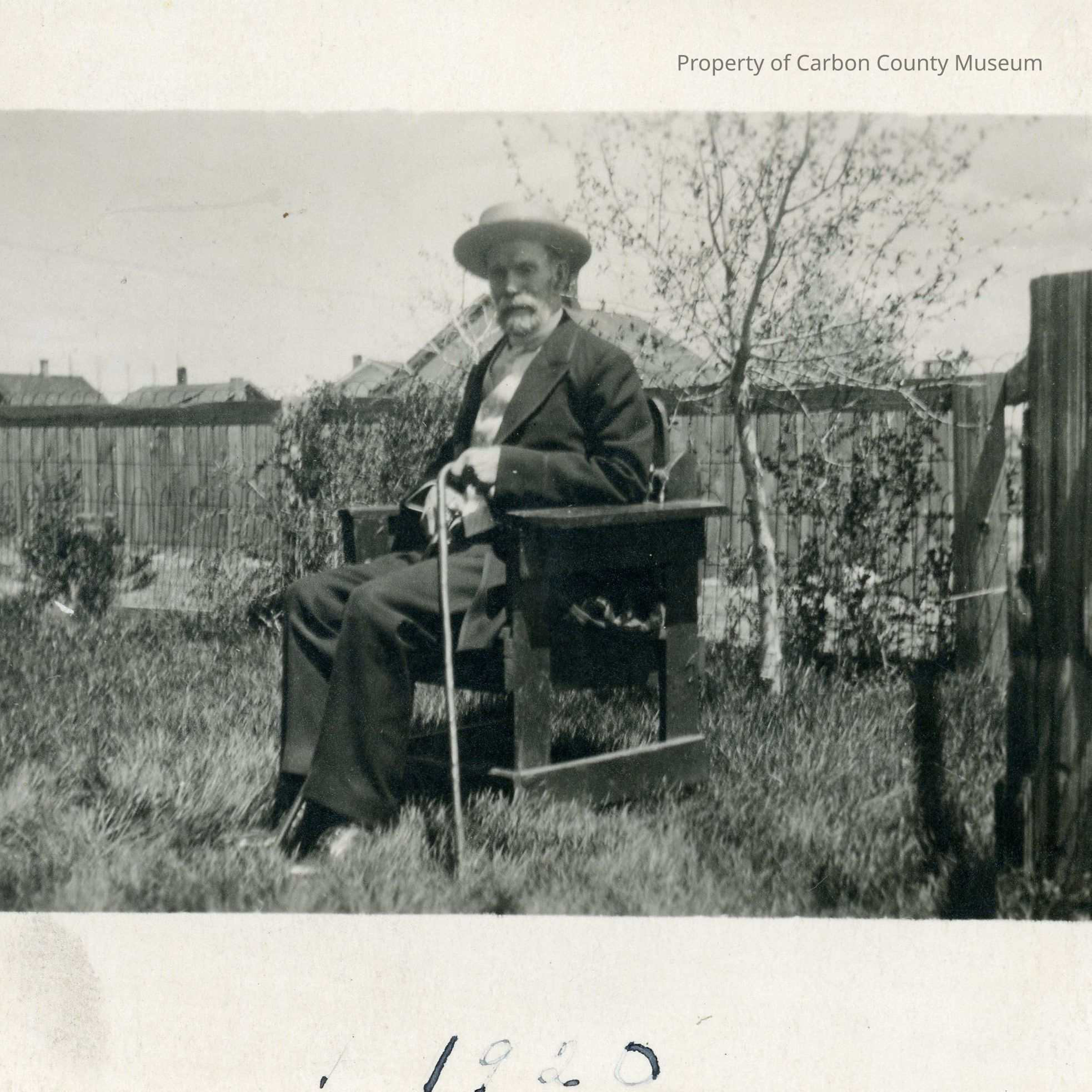 Update 2/2008: Black and white print. Photo of an elderly gentleman setting in a chair in a fenced yard. Gentleman has a cane in his right hand. he is wearing a dark suit jacket and pants. he has on a straw hat and has a mustache and beard. The chair is a wooden square shape. Tops of houses can be seen above the top of the fence to the left of the photo. A small tree is in the corner of the fence. "1920" written on bottom edge of photo in black ink.