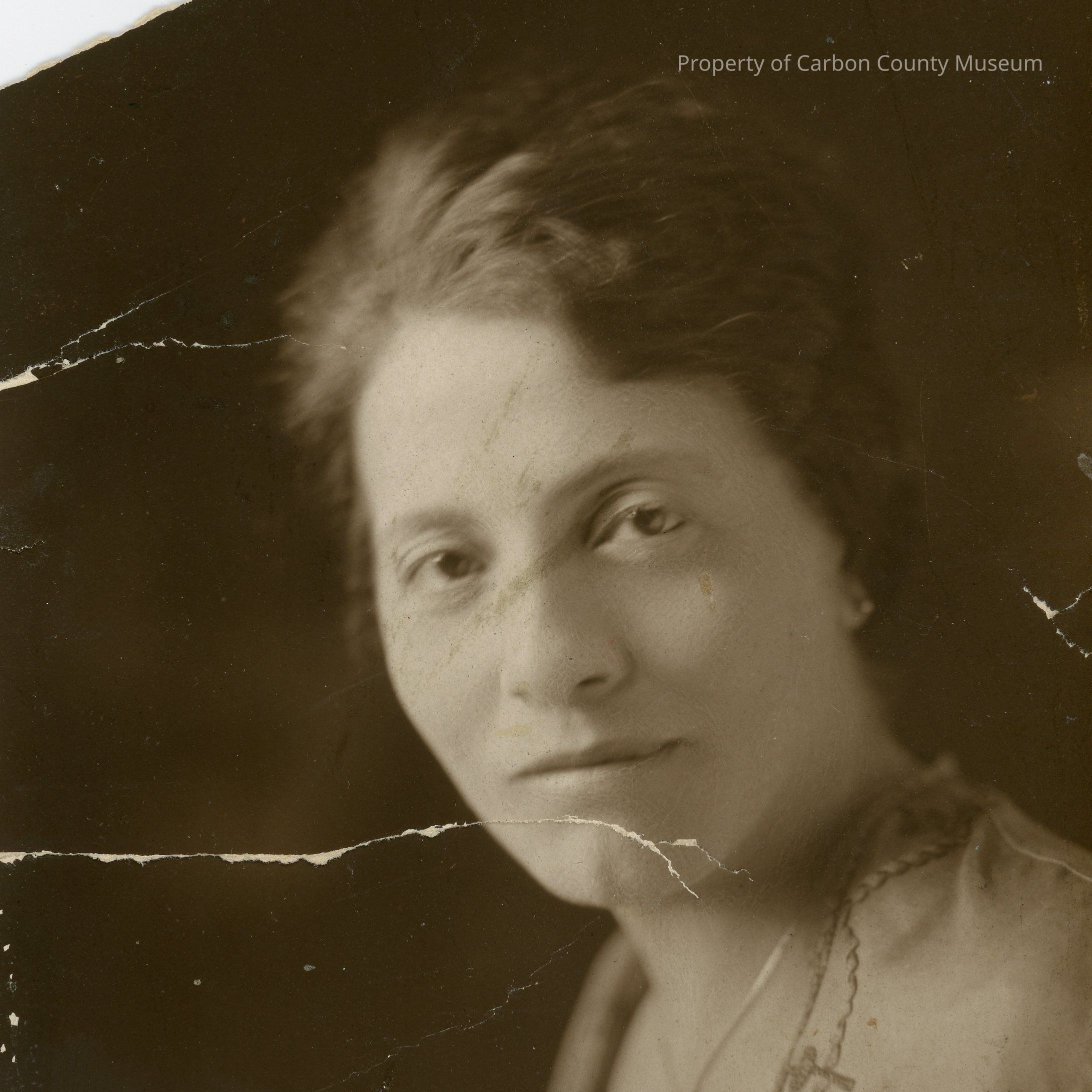 Update 2008: Sepia print. Bust photo of a lady in a light colored dress with a square front opening. Scalloped trim decorates square opening facing the shoulders. Lady has on a delicate necklace. Hair is combed back in a short hair style.