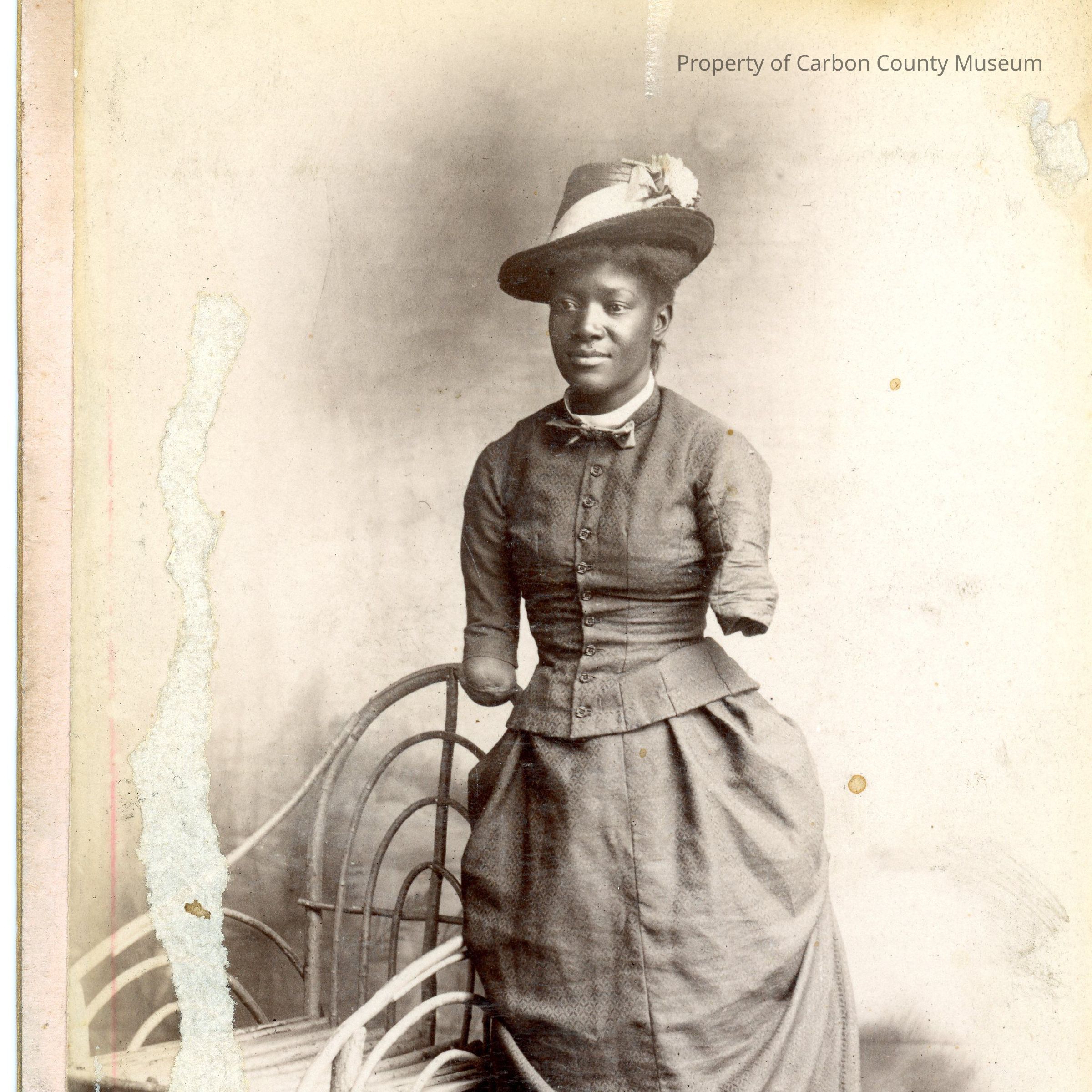 Update 2008: Black and white print. Photo of an African American lady in a long dark two piece dress. Lady has left arm missing below elbow. Right arm missing between shoulder and elbow. Lady has her hair in a short style under a hat with light ribbon on hat. Jacket of dress is buttoned down the front with a bow at the neck. Small white collar. Skirt has large ruffle at bottom. Lady is standing next to a bent wood chair. Lady appears to be standing on straw.