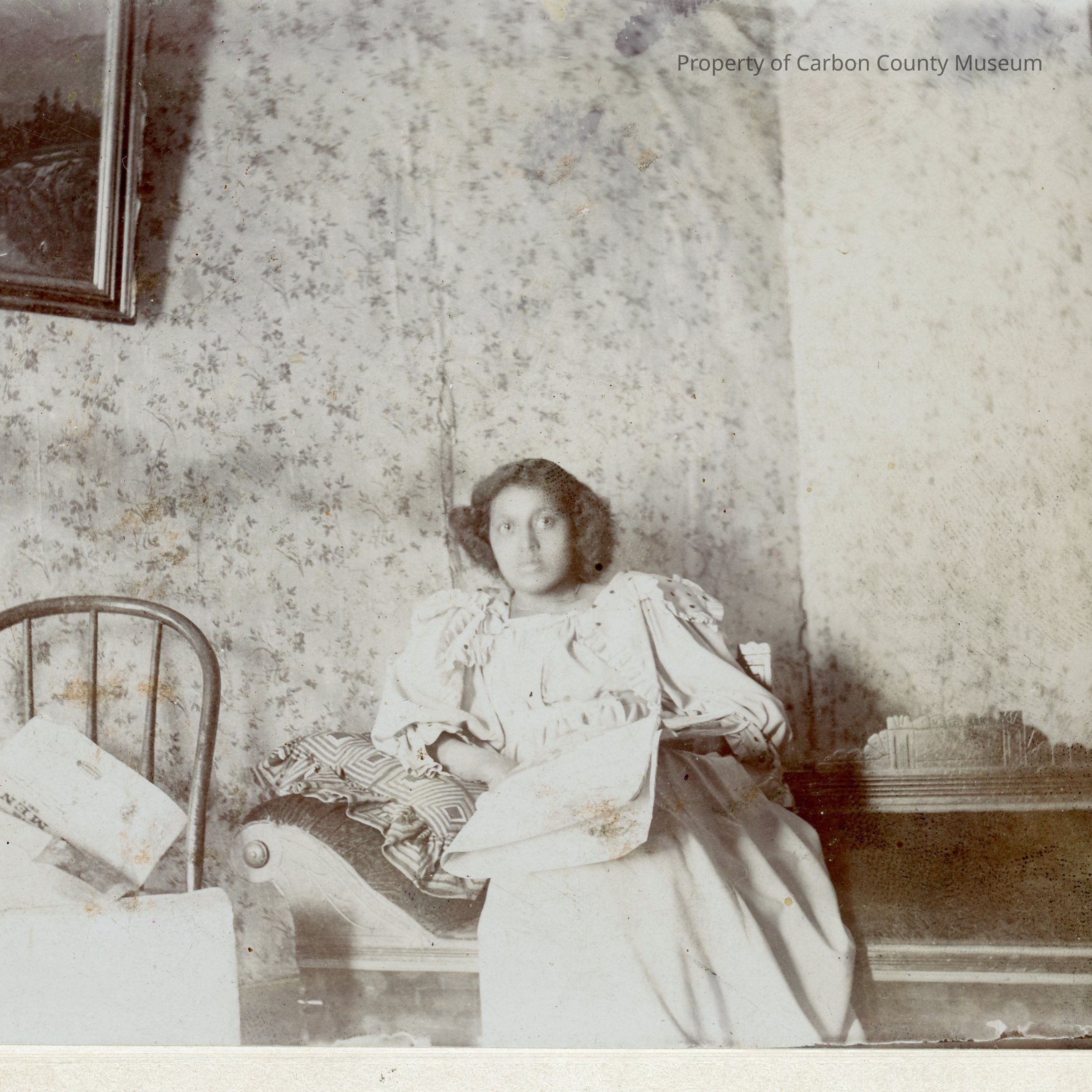Update 2008: Black and white print. Photo of a young lady sitting on a couch reading a newspaper. The couch is sitting side to side in a corner. Walls have flowered wallpaper and a picture on each wall. A straight back chair with more newspapers on it is at the right corner of the couch. The young lady is resting her right elbow on a pillow. She has on a light colored long dress. Dress has puffy sleeves that come just below her elbows. The young ladies hair appears to be short and curly.