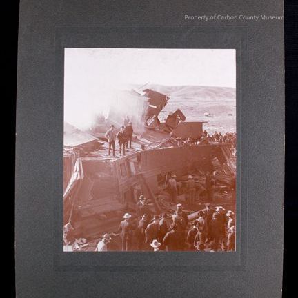Update - March 2010: Black & white print on black mat of train wreck. Image of a pile of debris of train cars twisted & mangled together. A group of men stand on the ground beside twisted cars & four men are standing on top of a car. In the distance you can see a sheep wagon & buck board wagon.