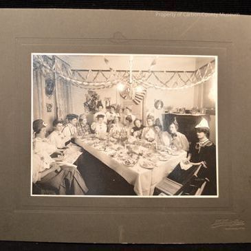 Update - 2009: 2 original black & white prints. Image of 17 ladies sitting or standing around a table set with food & decorations. Table has centerpiece of candles & small flags at each place setting, inserted into a piece of food on a small plate. Napkins are decorated with flags. One lady has fashioned her napkin into a hat, several other ladies have paper hats. All ladies are well dressed in ornate dresses or skirt & blouses and hats. All ladies have an object hanging around their necks on a ribbon. Crepe paper streamers hang from ceiling & light fixture above table. Flag across door on back wall. Small flags decorate wall hangings & bureau in background. Lace curtains are on 2 windows on photo left. Prints mounted on dark gray mat.