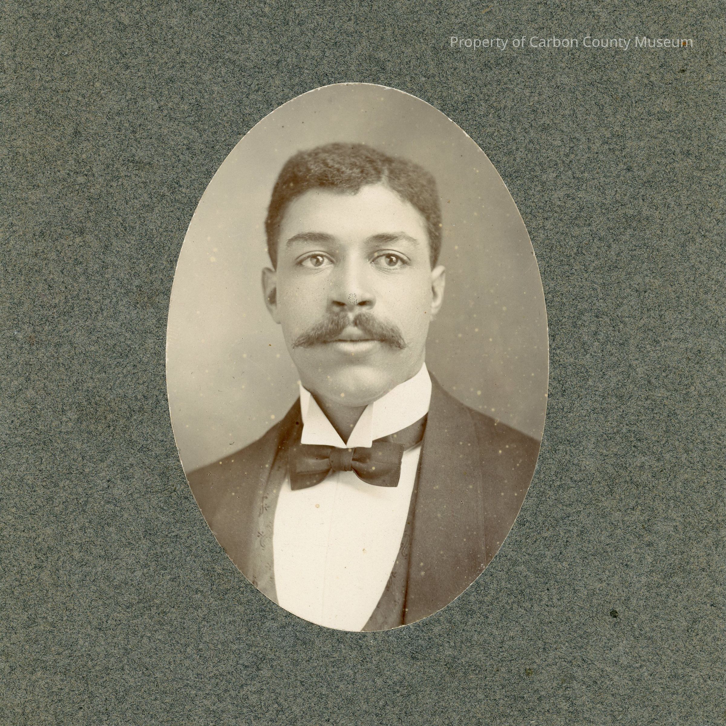 Update 2008: Black and white print. PHoto of bust of African American gentleman. He has on a dark three piece suit, white high collared shirt and bow tie. He has a mustache. Hair parted on right side.