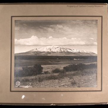 Update - 2009. Black & white print on two-toned tan with brown trim mat. Image of mountain covered with snow in photo center. A row of heavy clouds hangs over full length of mountain. Above that are lighter clouds. Ranch buildings are in front of mountain, houses near photo center & barns & out buildings toward photo right. Two fences are running parallel & curve toward house. A corral is inside fence enclosure. In foreground are bushes & tall grass.