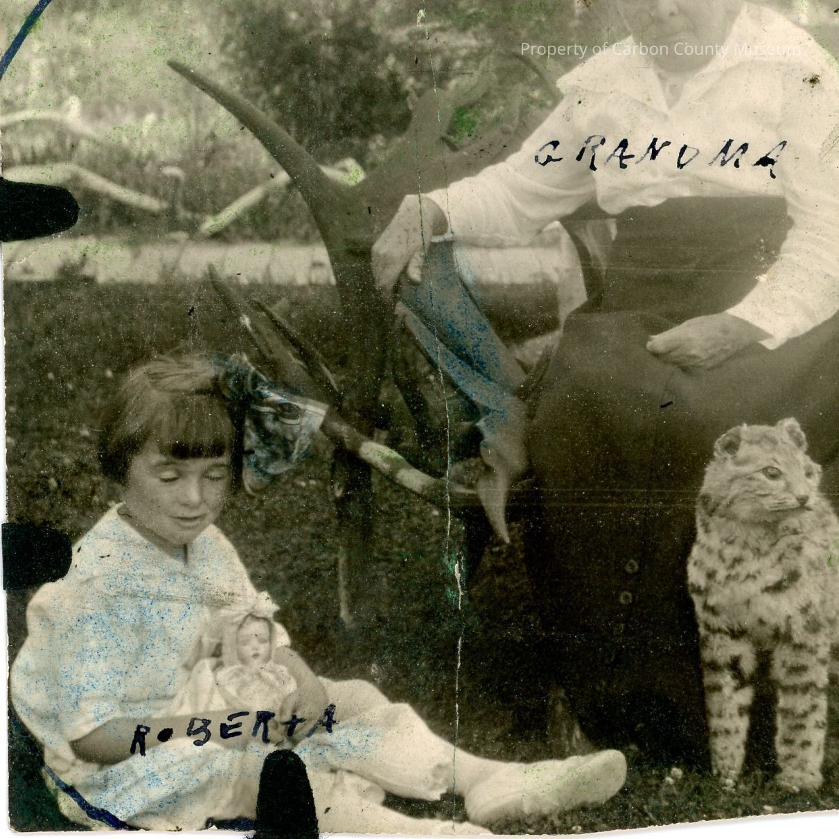 Black and whit photograph. A women is sitting outside on a chair made from elk antlers, at her feet is a stuffed bobcat/lynx. Setting on the ground to the woman's left and right are two young girls, each is holding a doll. From left to right the people are identified as "Roberta", "Grandma", and "Me". Written on the reverse in black ink is the following: