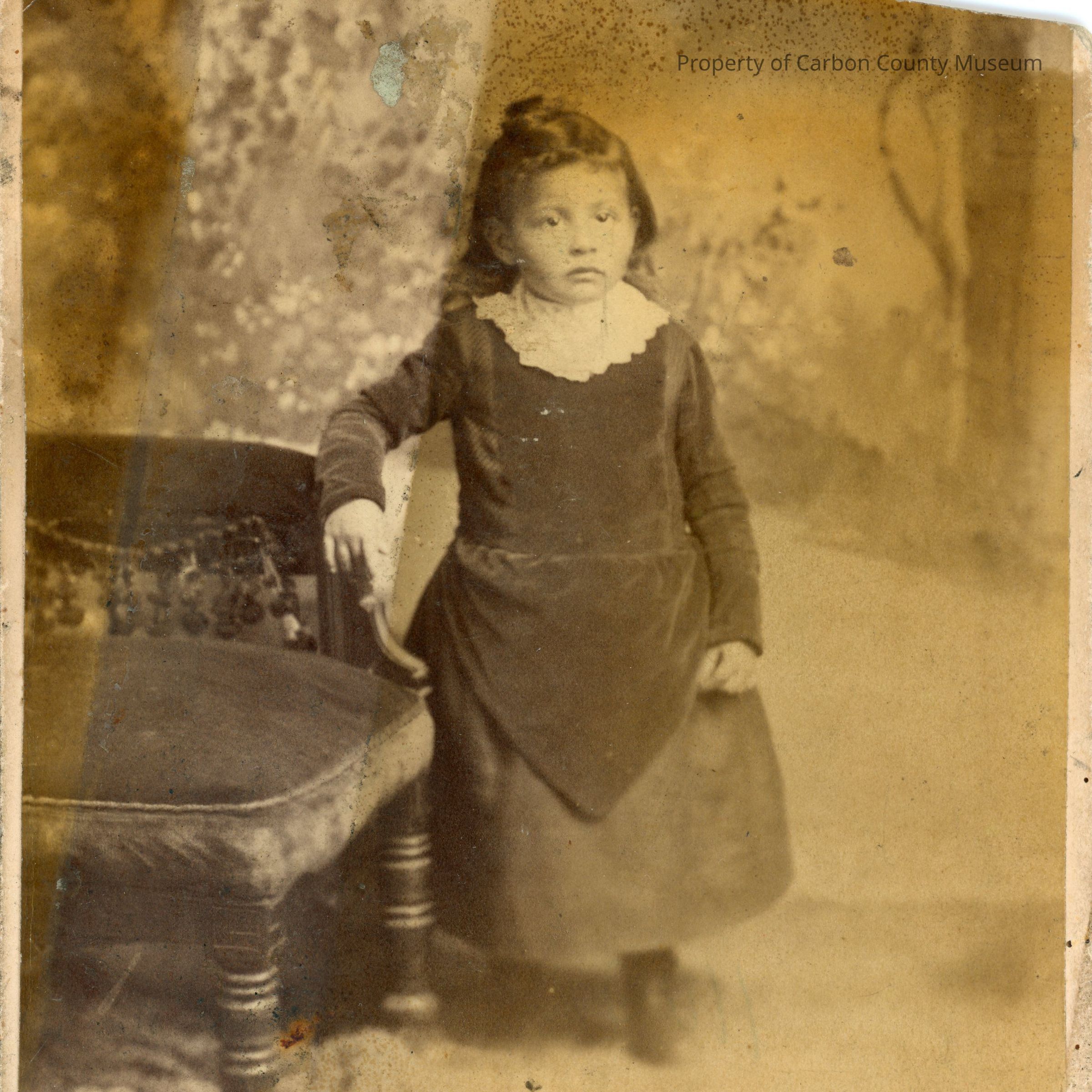 Update 2008: Black and white print. Photo of young lady in a long dress with large white lace collar. Dress appears to have a "V" shaped apron front half way down to skirt. Shirt is a little bit lighter color than rest of dress. Dress is a dark color. Little girl is standing by a table with her left arm resting on the table. Her hair has a large curl on top and the rest appears to hang loose down her back.