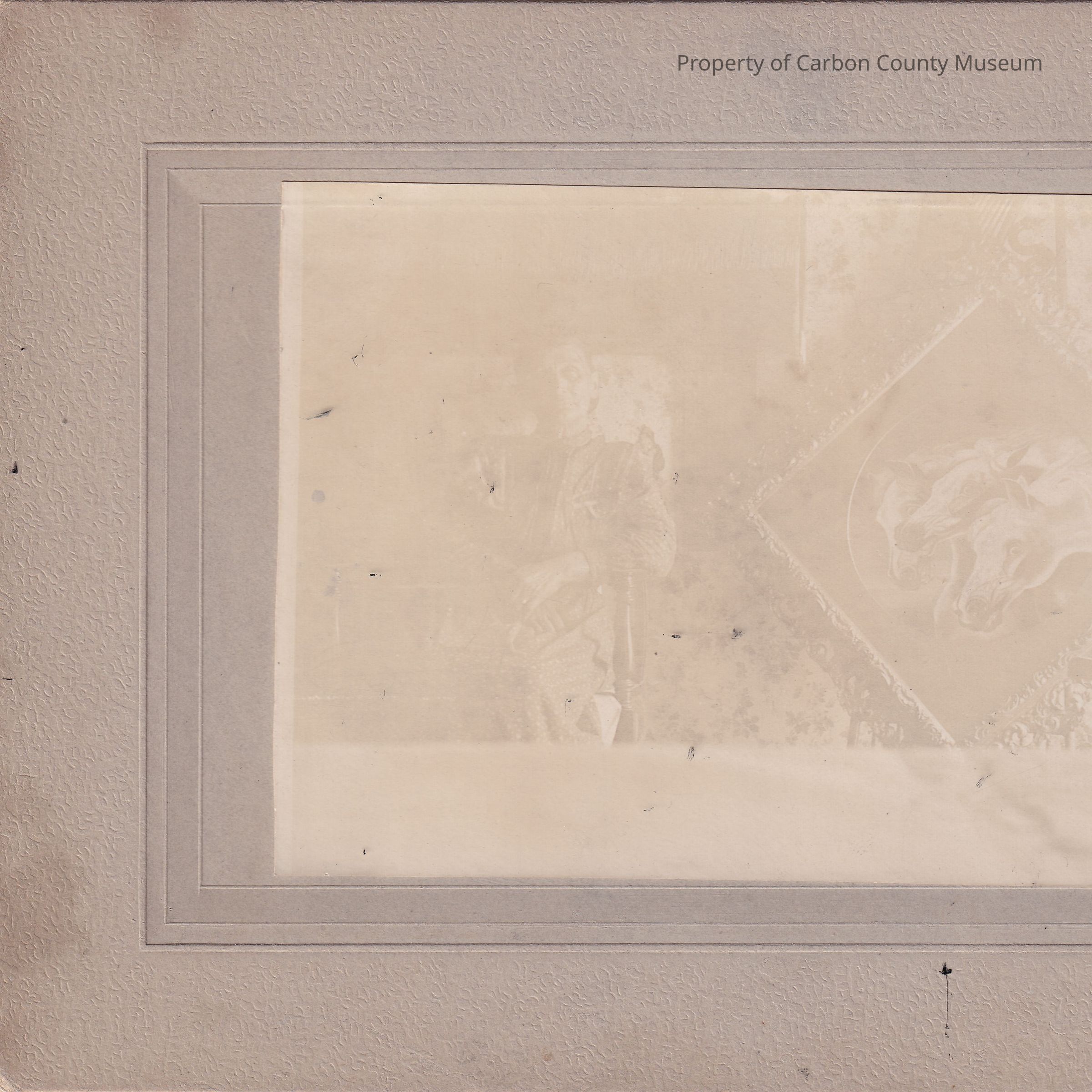 Cabinet card photograph, photograph is of a woman sitting next to a painting of three horse heads