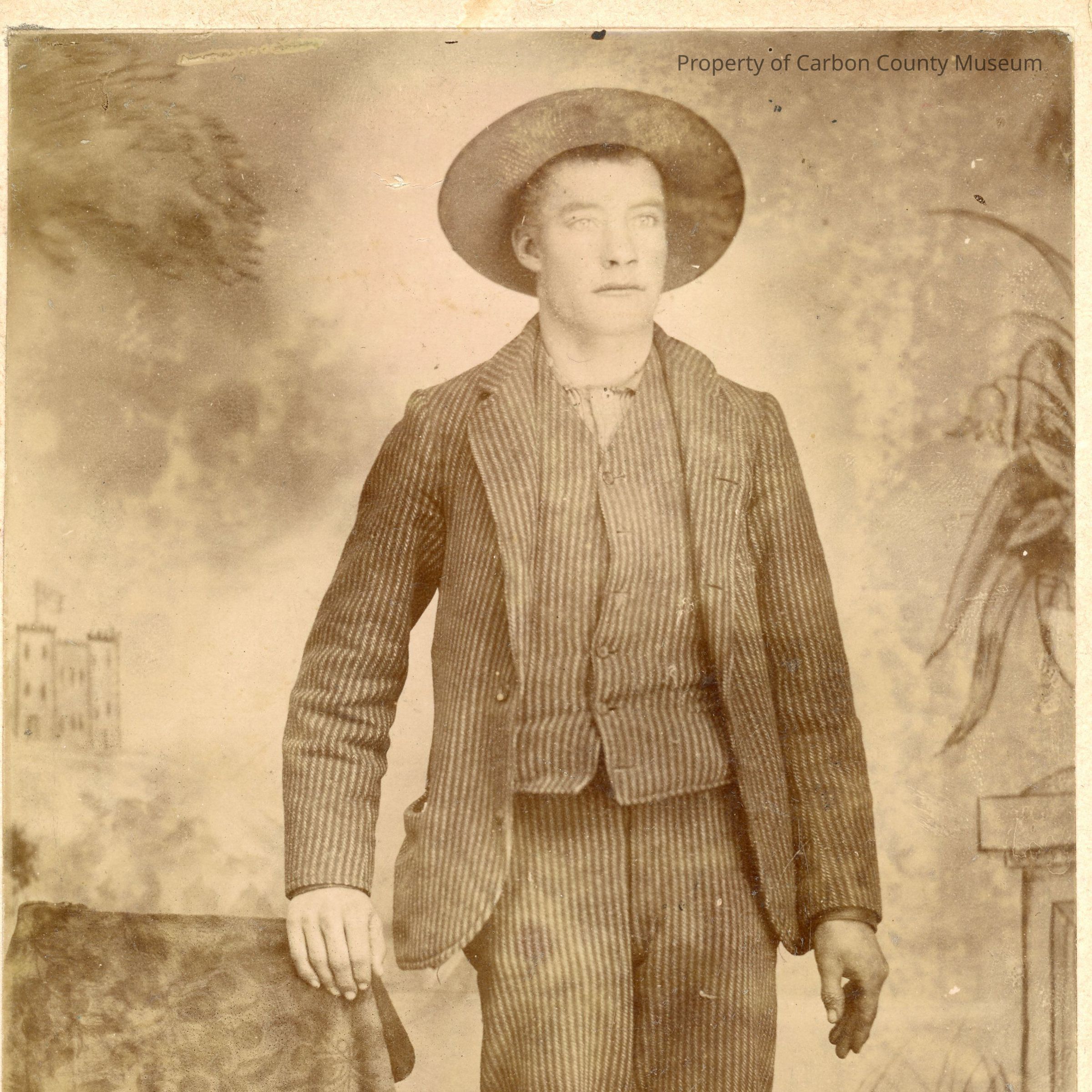 Update 2008: Sepia print. Photo of a young gentleman in a pinstriped suit (3 piece), medium colored shirt with no tie. He has on a medium brimmed hat. His left hand is resting on a covered table. Jacket is unbuttoned and open.