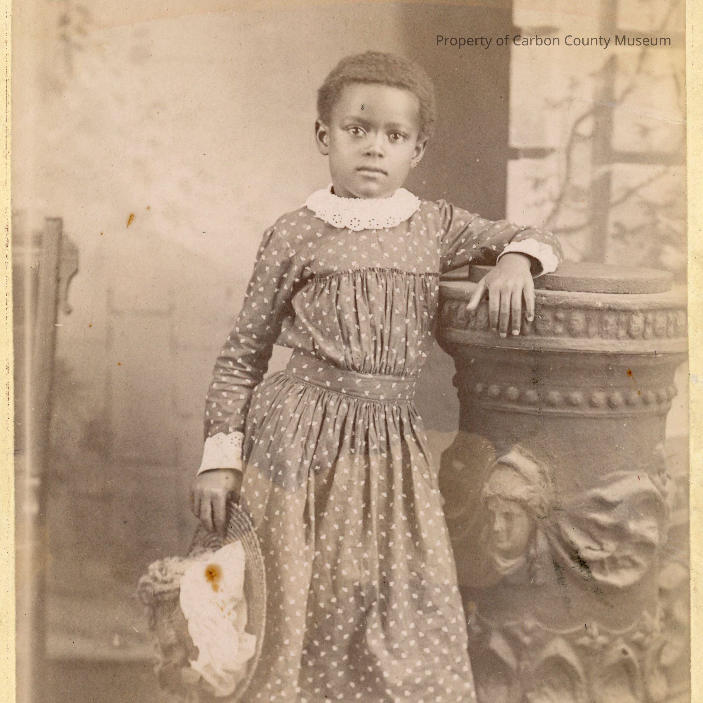 Update 2008: Sepia print. Photo of a young African American girl in a dark polka dot dress, with white scalloped neck collar. Dress has white scalloped cuffs at edge of long sleeves. Dress is long and girl is holding a flower, medium brimmed hat in her left hand. Ribbon of hat is touching floor. Girl is standing with her right arm resting on a decorated pedestal, her right leg is crossed in front of her left resting on the toe. Her hair is a very short hair style.